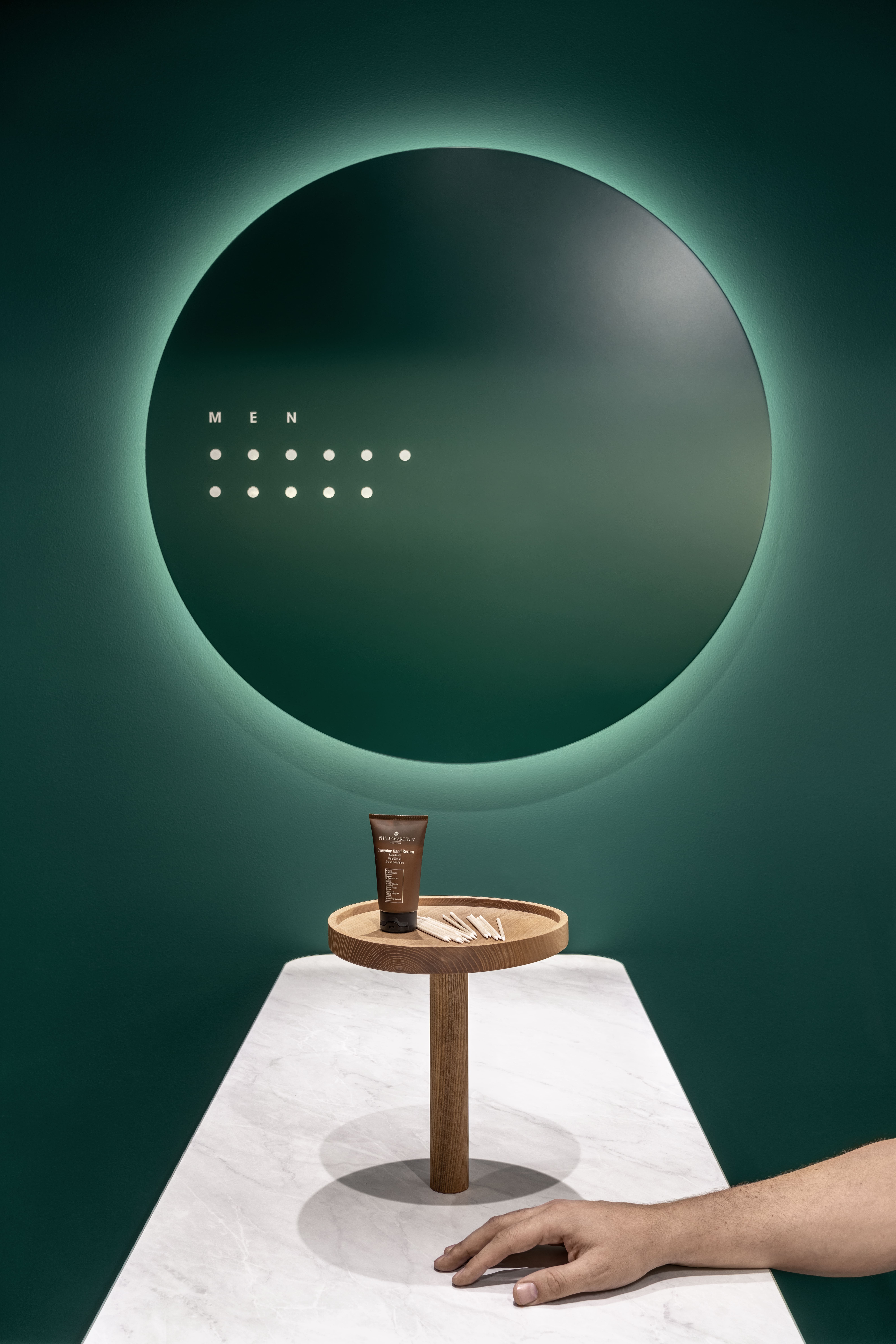 The men’s zone has a bathroom for which we have created a green concrete sink in collaboration with Vadim Artemenko and his C.I.Form workshop.