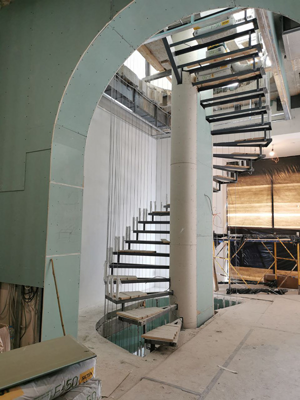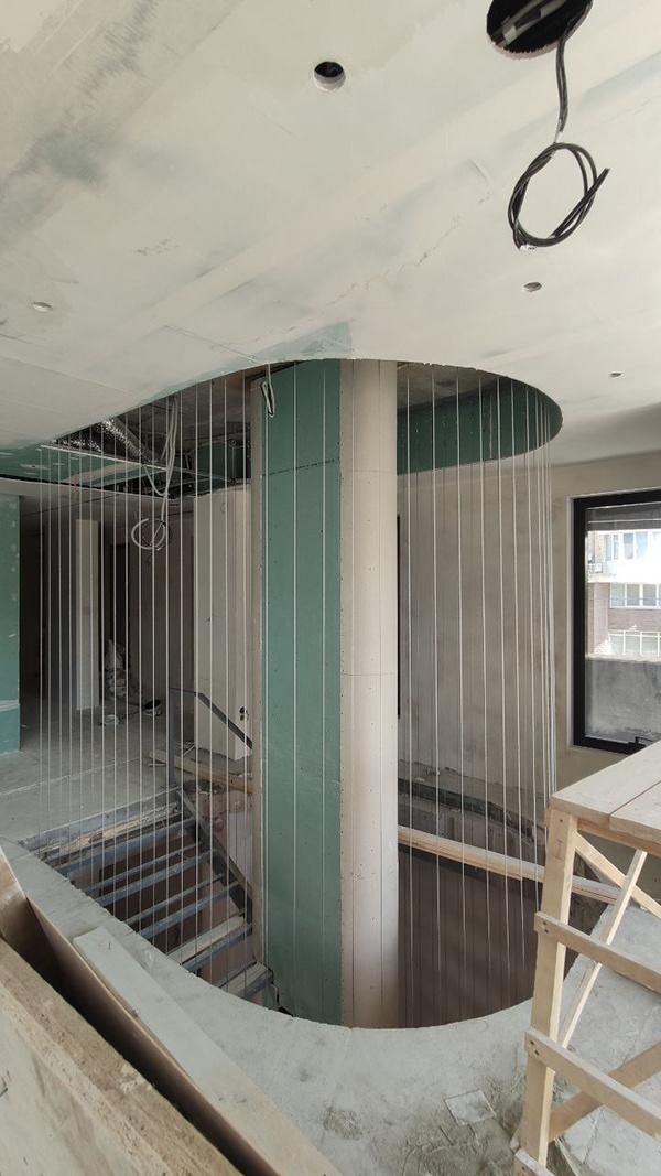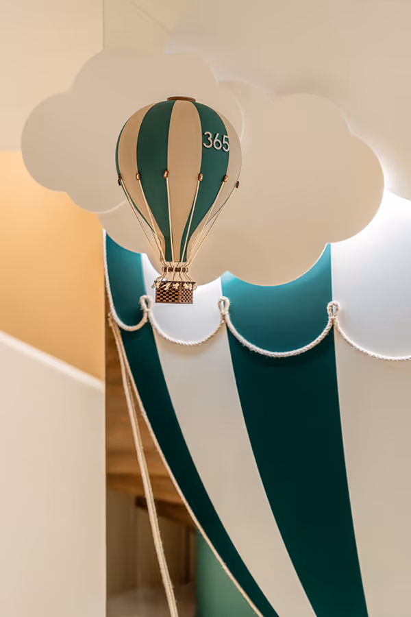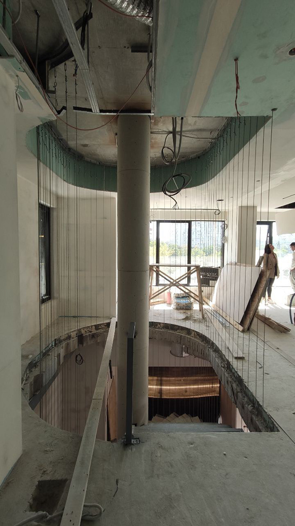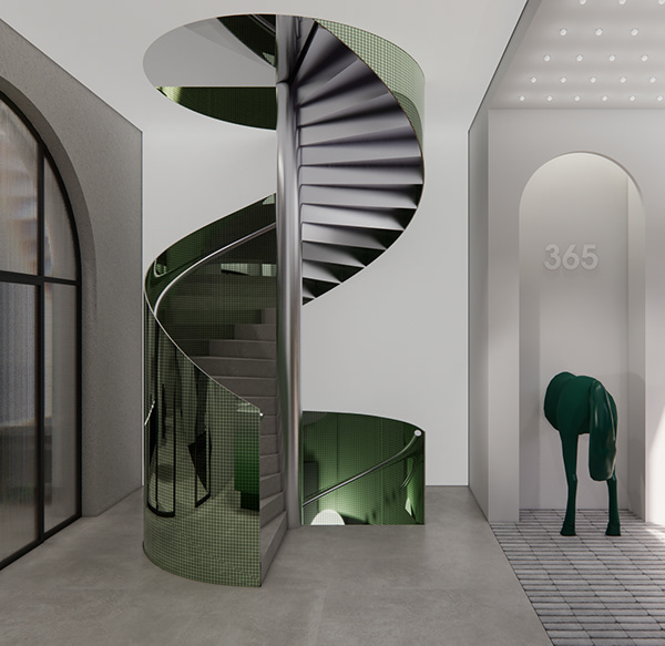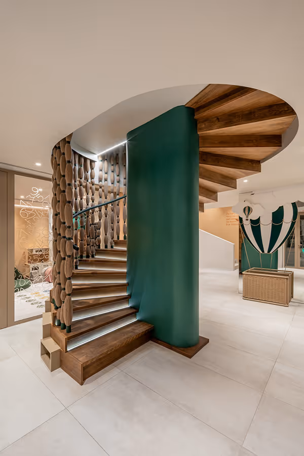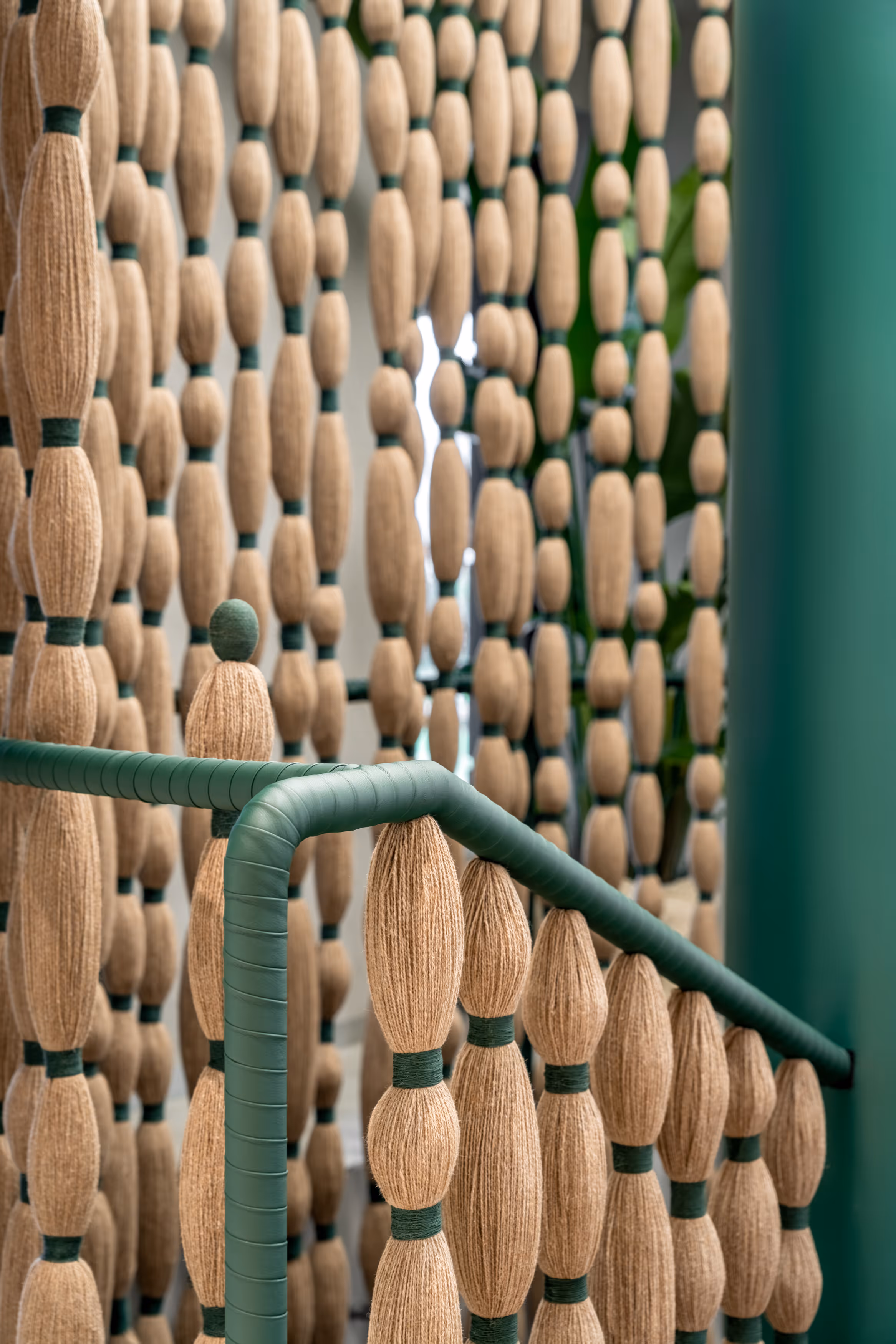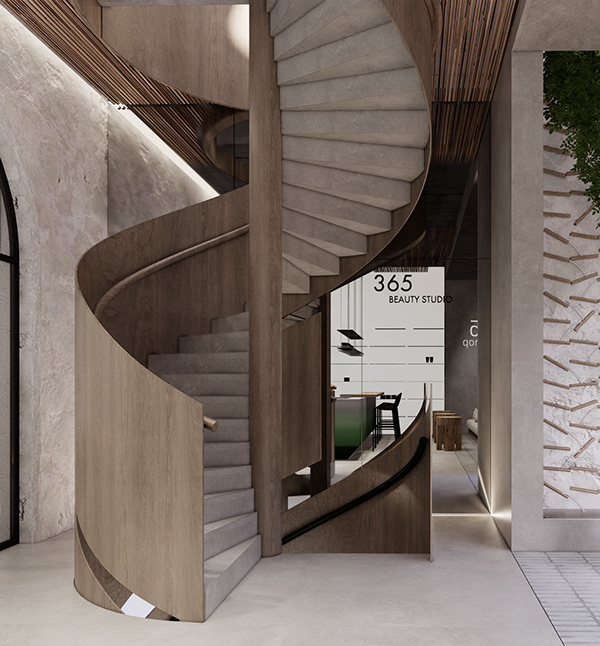 The most complex architectural element of the project is the large spiral staircase. The initial layout of the premises included the staircase in a different location, which did not align with the ergonomics and functional zoning of the beauty studio. After approval from the building’s architects, a new opening was cut into the floor slab between the levels, and two support columns were installed. The semi-spiral staircase connects all three levels of the studio. Its structure is suspended on metal cables, decorated with cotton fibers in a tropical style. The metal handrails are integrated into the cable and support system and are wrapped in green leather. Ascending to the second floor is a metaphorical journey into the jungle.