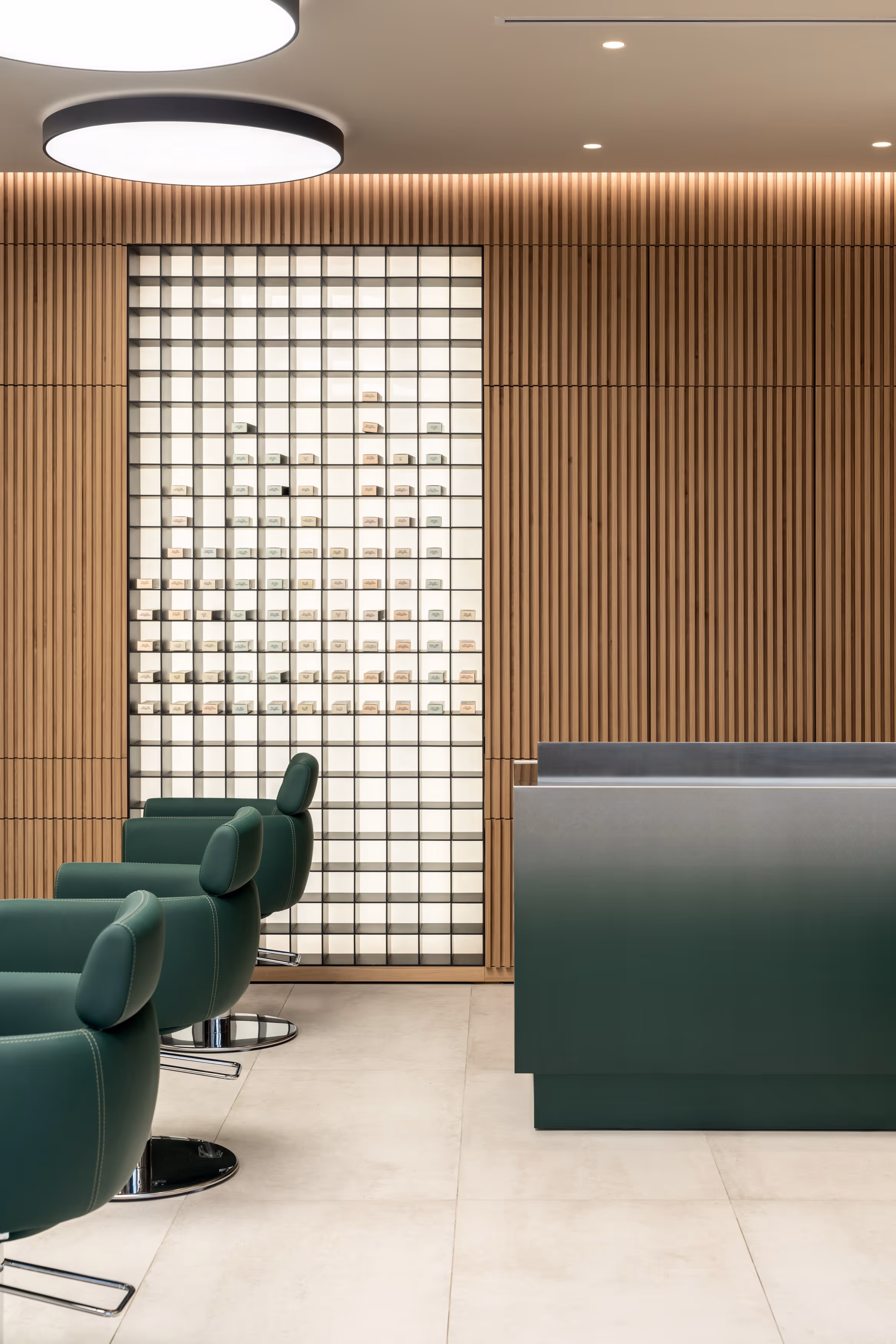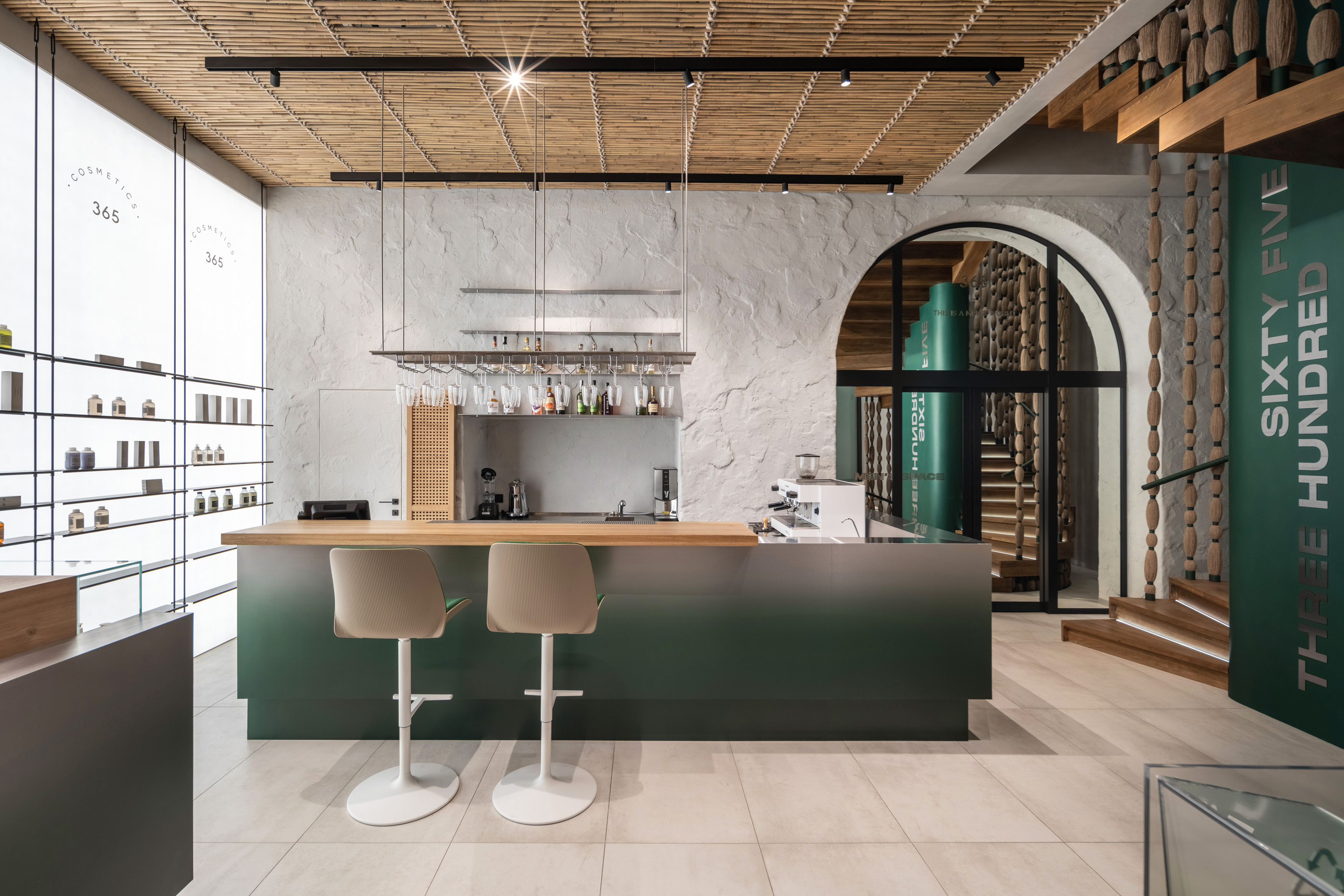 The signature style of the 365 network combines green and white colors. In the new project, the designers reimagined this palette by incorporating green as a gradient on metal facades. The cool sheen of stainless steel adds a contemporary touch to the space.