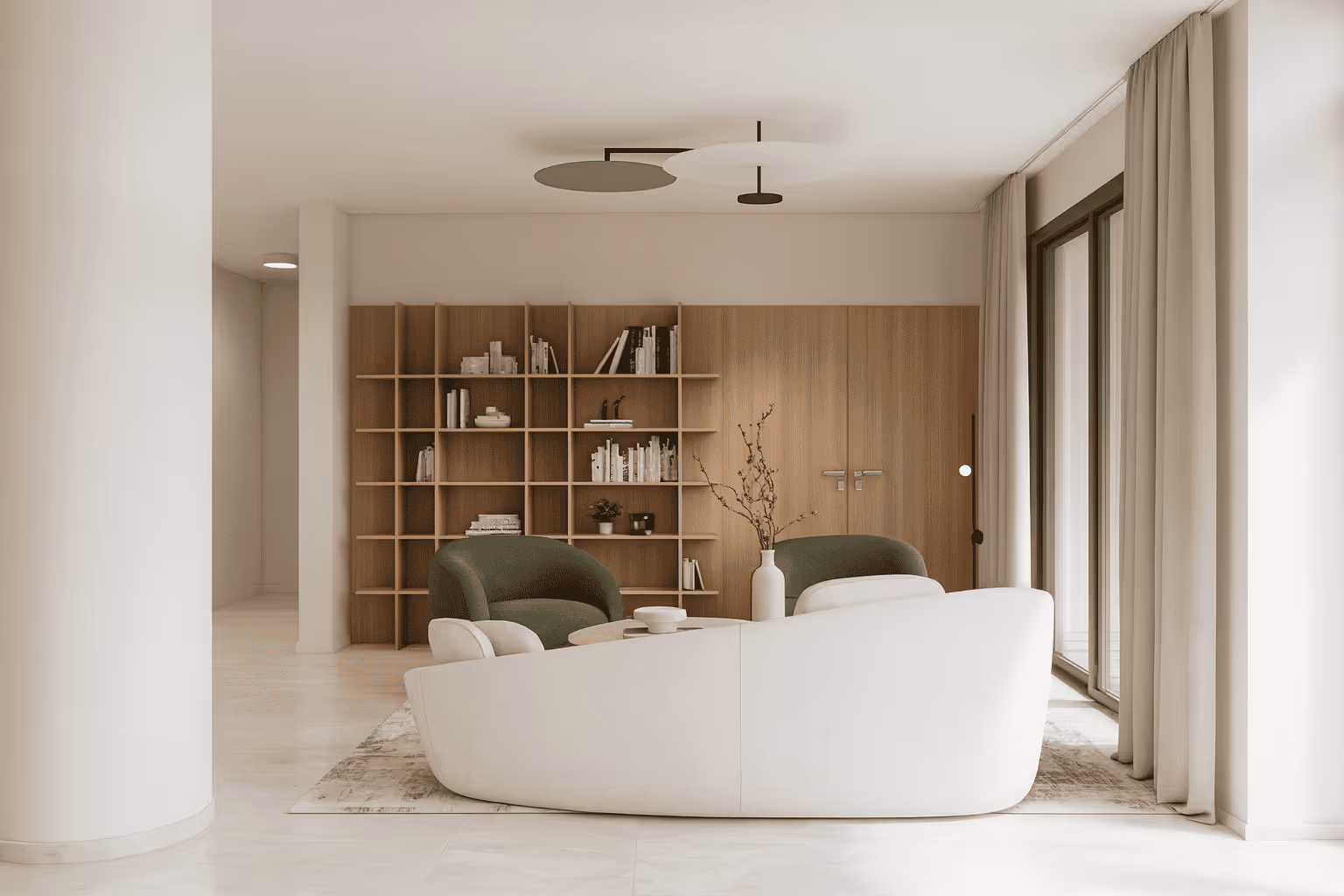Natural materials — wood, stone, and textiles made from natural fibers — define the space. A palette of calm tones, ranging from warm beige and soft gray to deep green, creates a harmonious, organic atmosphere. Lighting fixtures and furniture with clean geometry add sophistication, balancing aesthetics and functionality.