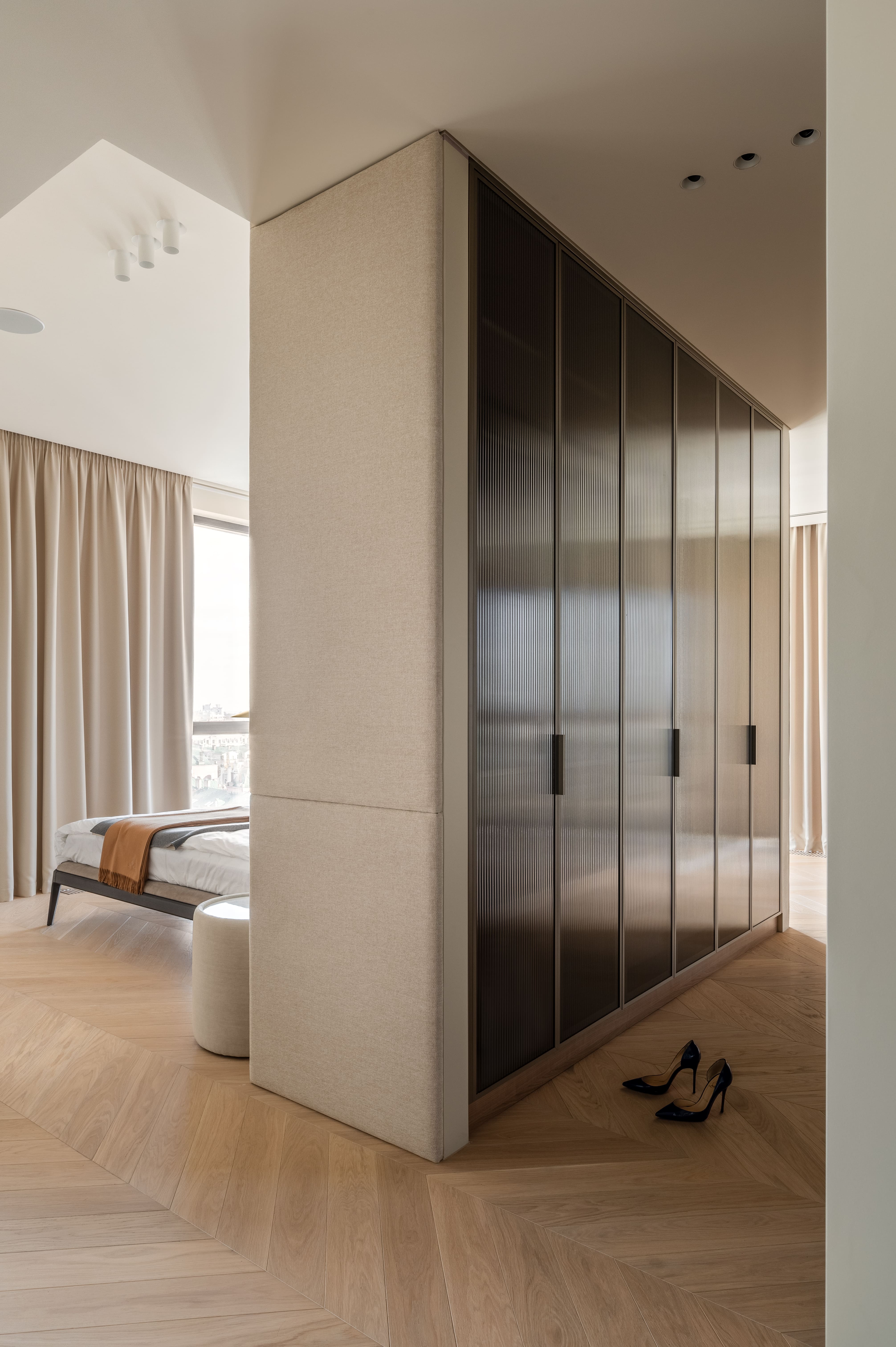 The master bedroom is a place to admire sunsets. Panoramic windows, a semi-transparent wardrobe, mirrors, and a soft headboard — like a scene from a romantic film.