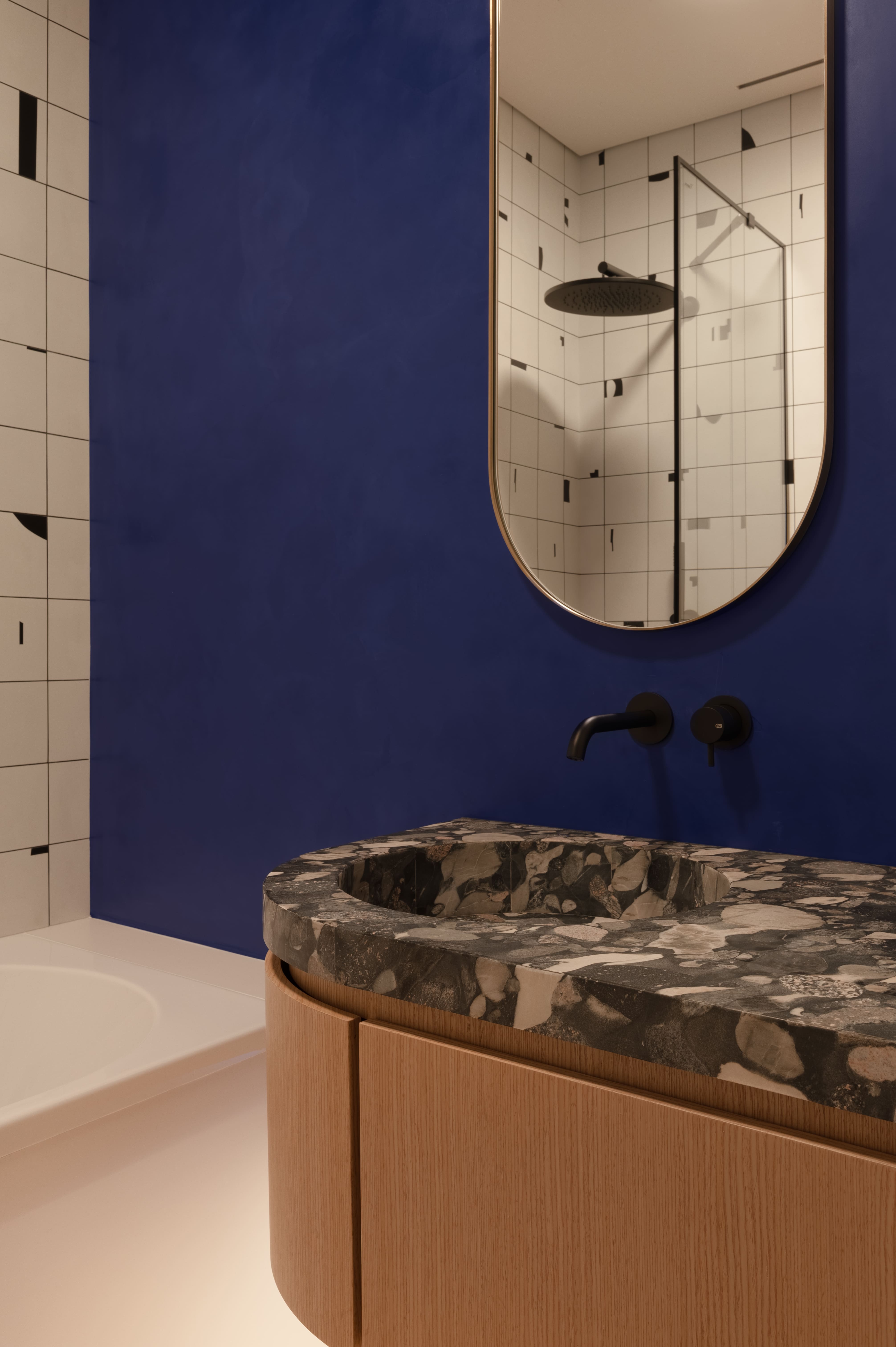 The guest bathroom continues the overall design philosophy: restrained, minimalist, with a focus on tactility and materials.