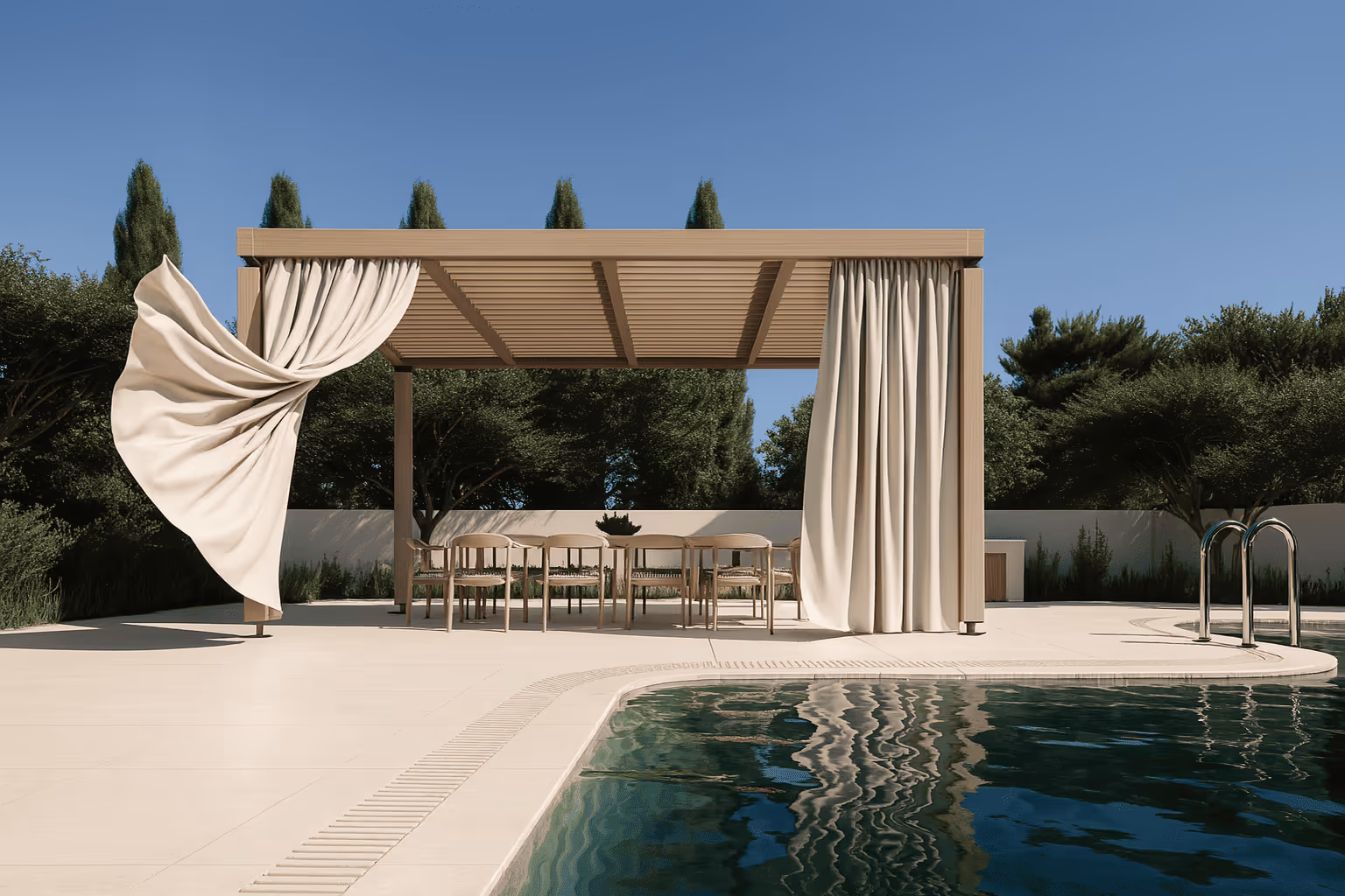 The landscaped courtyard is a true resort escape: a swimming pool with loungers, umbrellas, and side tables for drinks, and nearby — a cozy barbecue area under a large pergola. A spacious dining table and outdoor kitchen make it the perfect spot for long summer evenings overlooking Mediterranean pines.