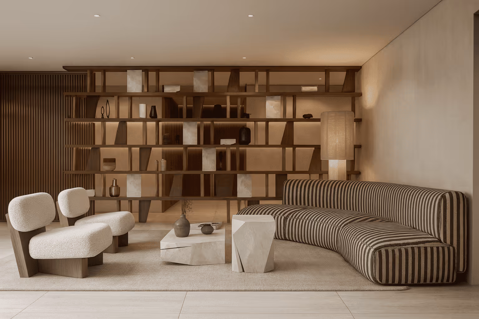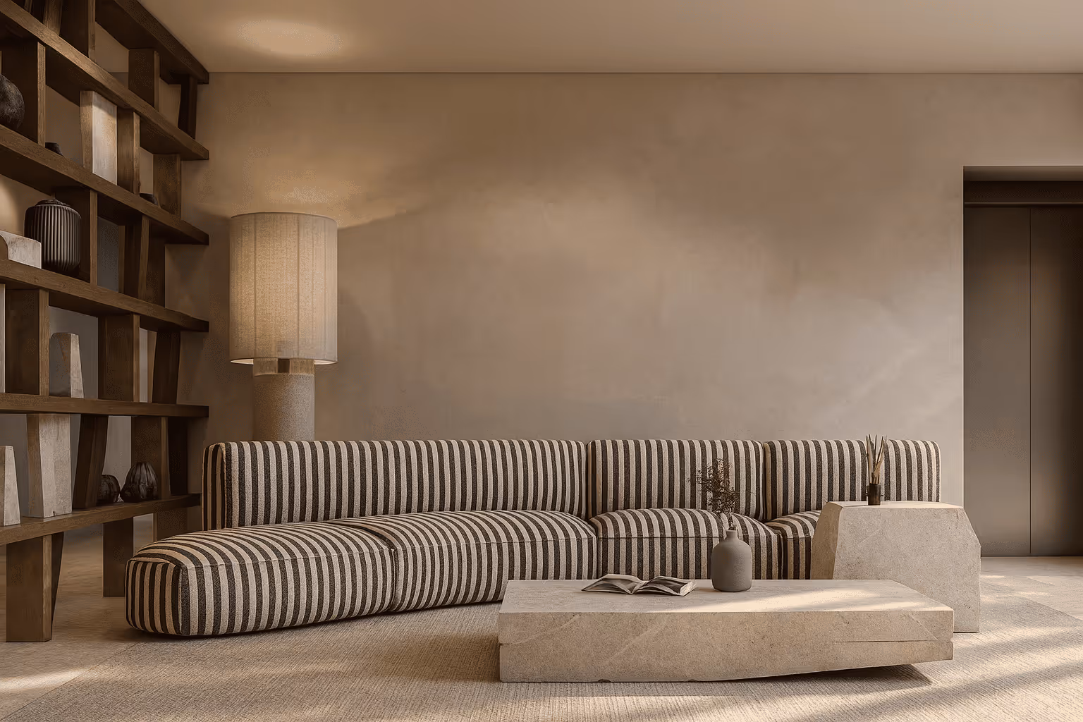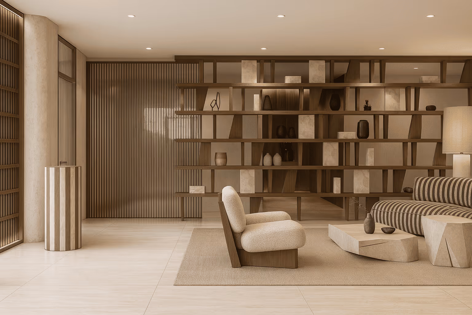 The lobby design reflects the entire concept of the building — refined simplicity with a coastal vibe. The focal point is an architectural composition of natural wood with travertine inlays, serving as both a partition and a shelving unit. In the waiting area, a stylish sofa with a textile stripe subtly recalls a maritime motif. The atmosphere is warm and welcoming, filled with natural textures, soft light, and a sense of ease.