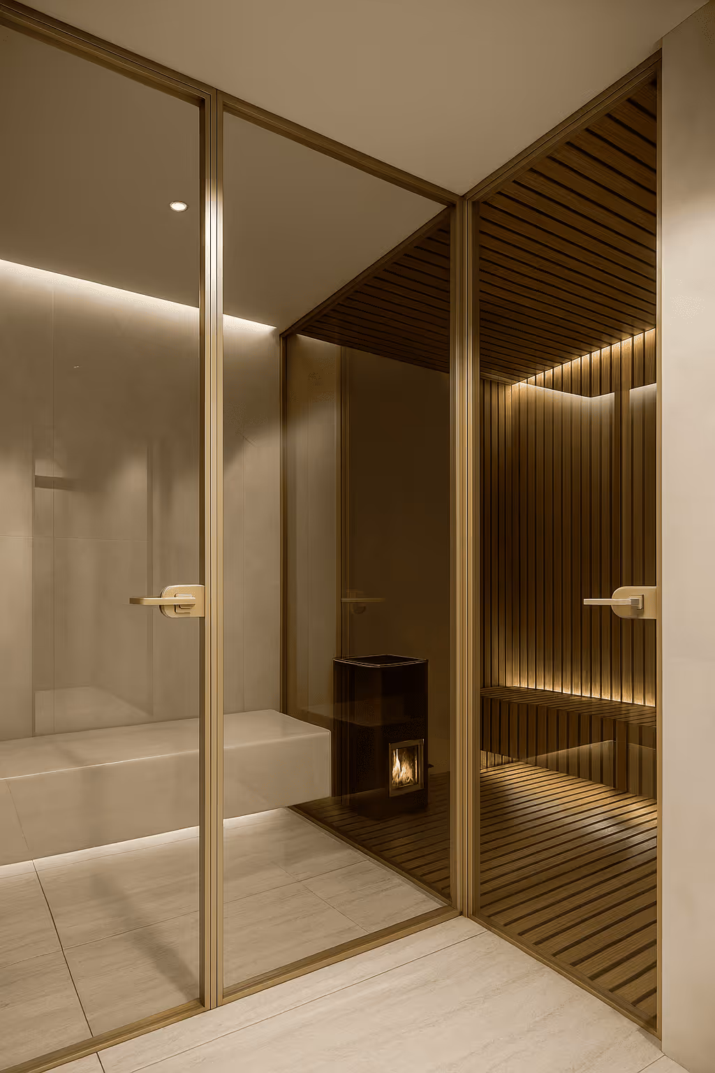 The spa area is a true sanctuary. The sauna, hammam, changing rooms, showers, and restrooms are all finished in the project’s signature palette. Here, everything is designed for restoration — the space radiates calm, quiet, and care for oneself.