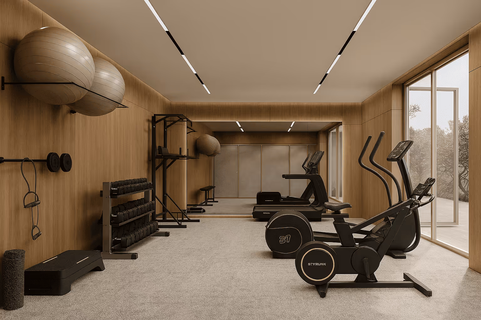 The gym is a natural extension of the building’s wellness philosophy, equipped with professional fitness machines, functional flooring, and panoramic windows overlooking the landscaped grounds — a setting that inspires and energizes workouts.