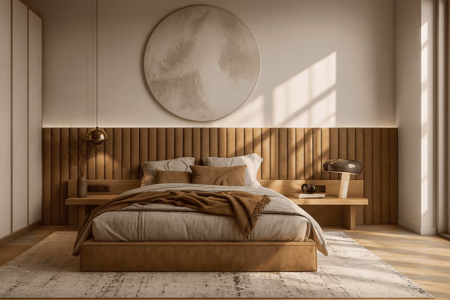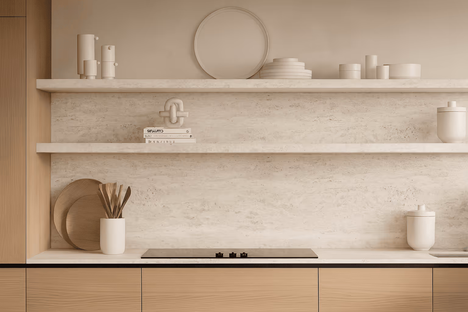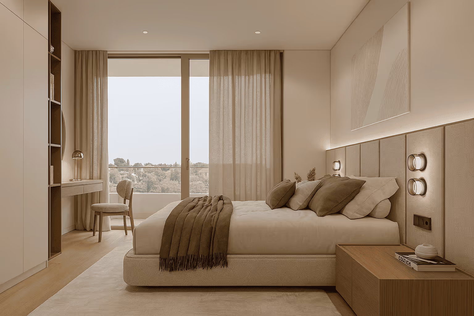 All interiors continue the philosophy of the local setting. One such apartment, designed by our studio as a showcase, is finished in a light, natural palette — shades of sand, ivory, white stone, and soft-toned wood create a sense of calm and lightness. Terracotta accents bring warmth and character.
