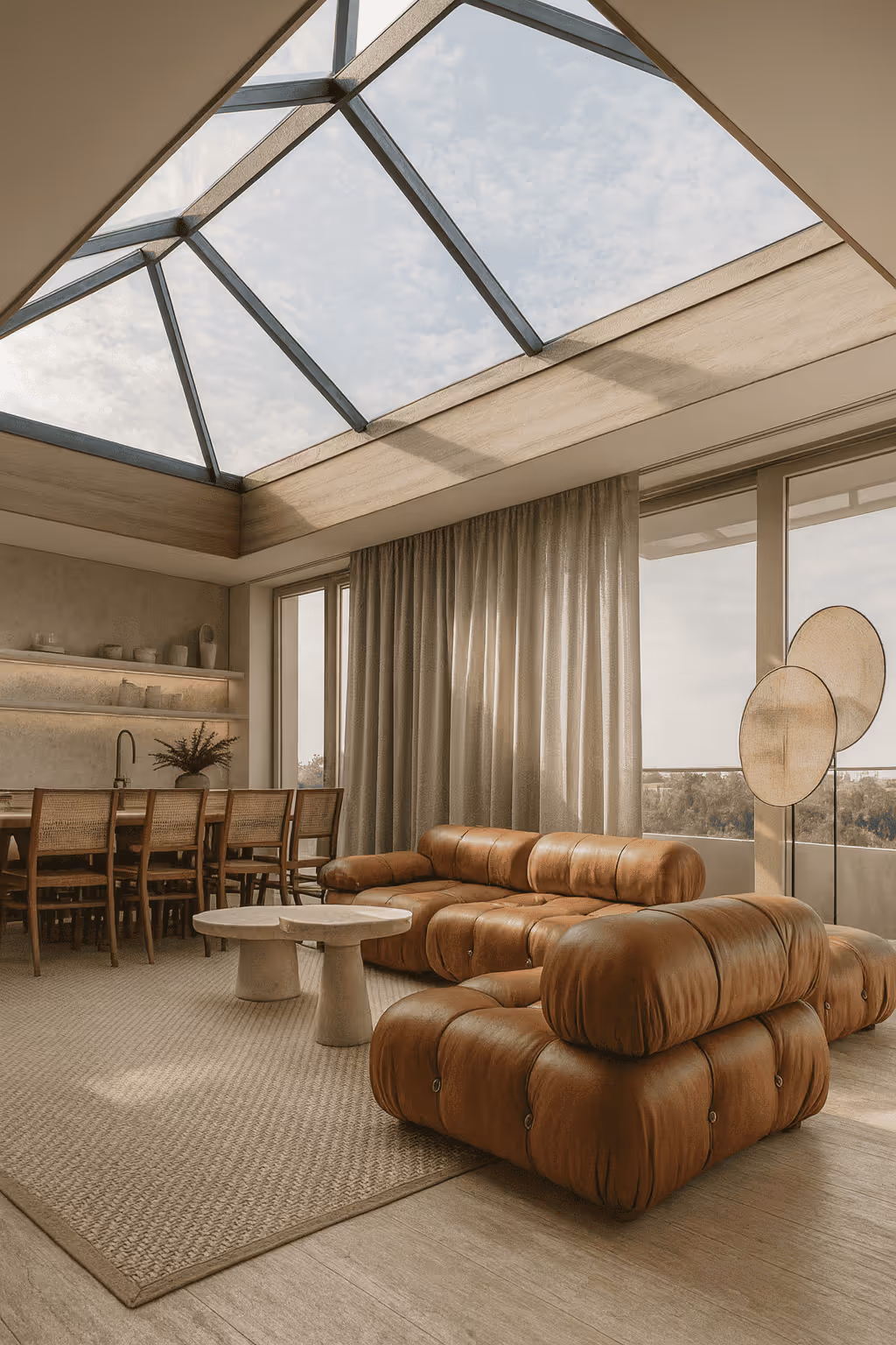 The centerpiece of the apartment is a lounge area with a skylight window, flooding the space with daylight and subtly shifting the mood throughout the day. This architectural element blurs the boundary between interior and nature — the sky becomes part of the design.
