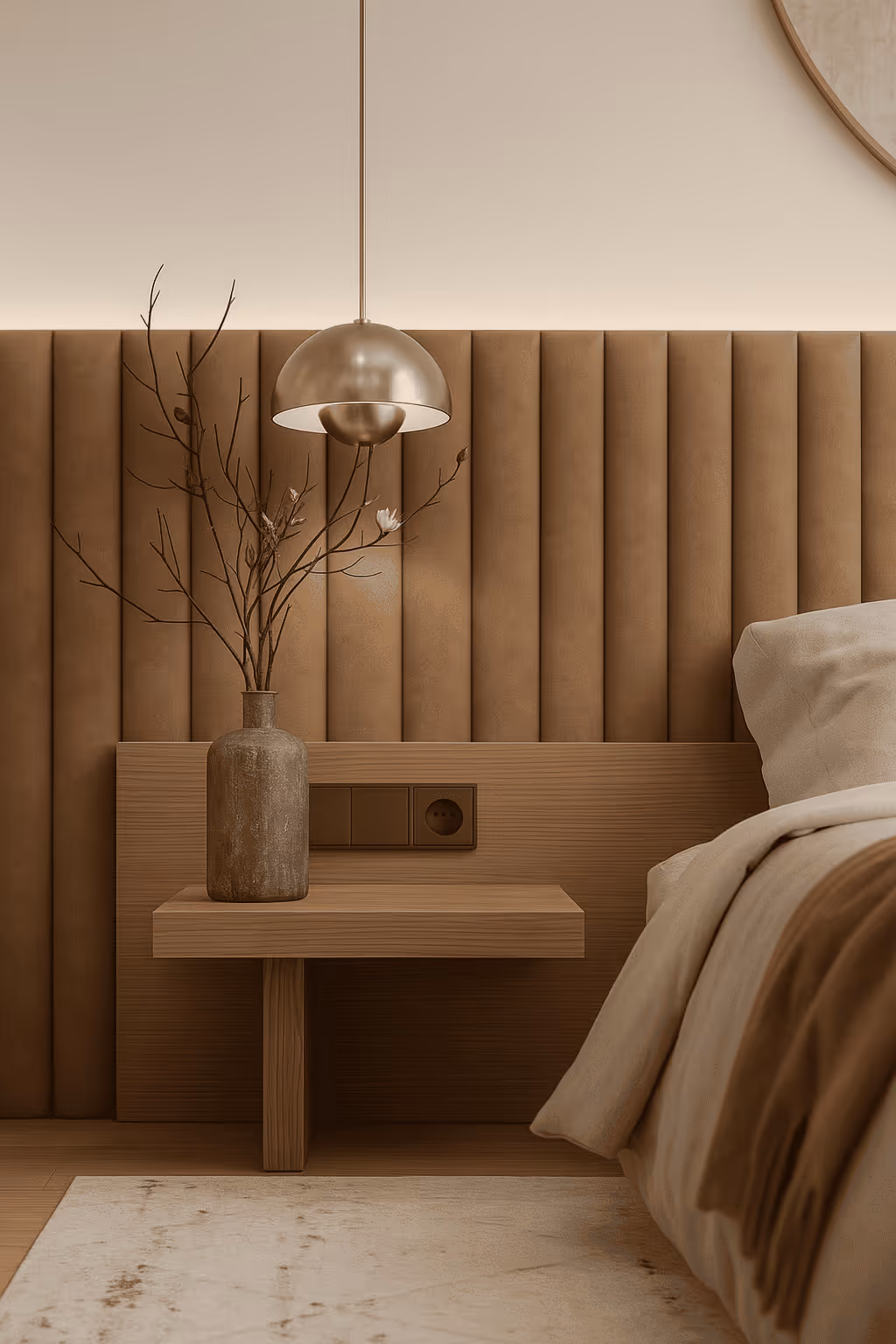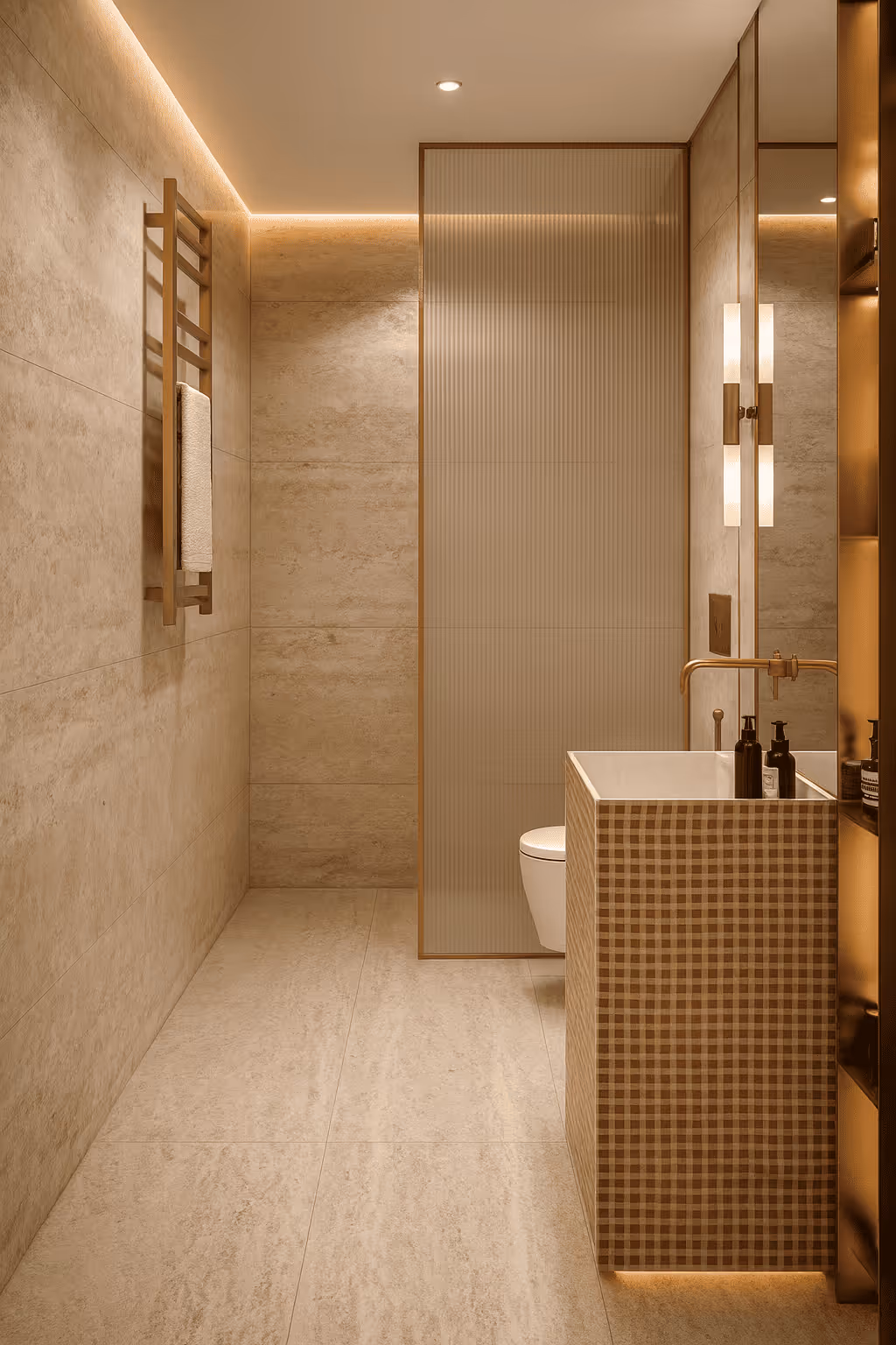 Every zone of the building reflects a love for natural materials. Warm travertine, light-toned wood, tactile fabrics, and sandy shades create an interior that breathes authenticity. Elegant brass accents — door handles, frames, and apartment numbers — add a touch of refined brilliance and stylistic completeness.