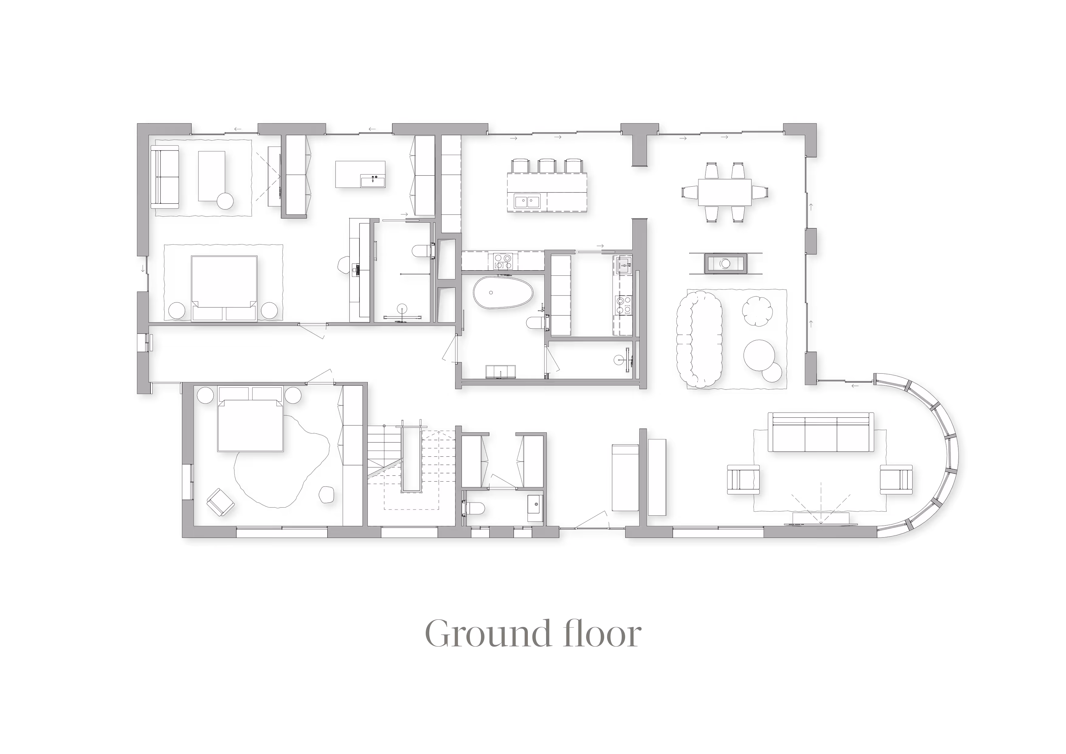 The first floor is the heart of the house. A spacious living room with a fireplace flows into a second, more intimate lounge area with a TV, while on the opposite side lies the dining room.