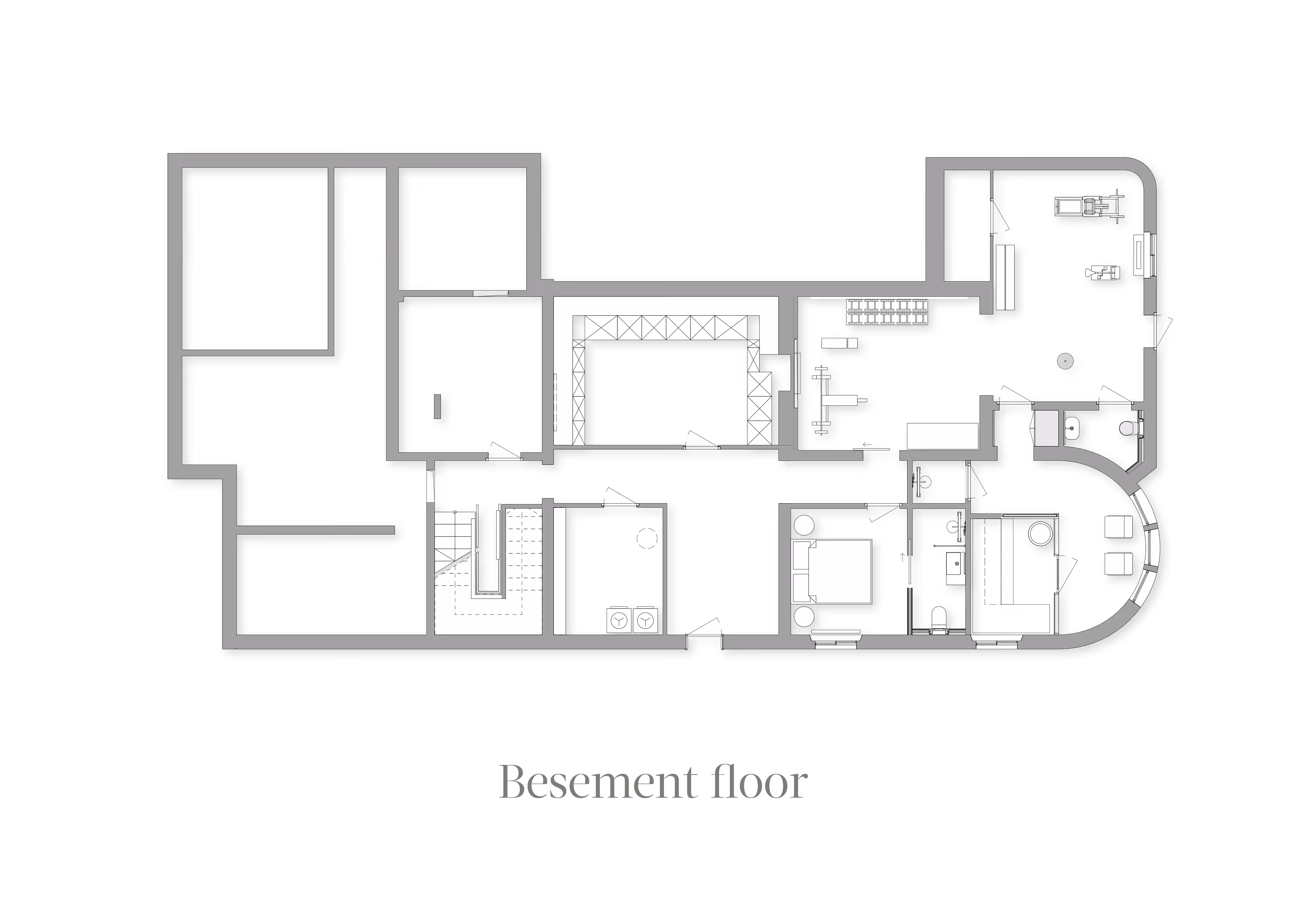 The lower ground floor brings together the leisure and wellness areas — a gym, a SPA zone with a sauna, a wine room, a guest suite, and several technical spaces.