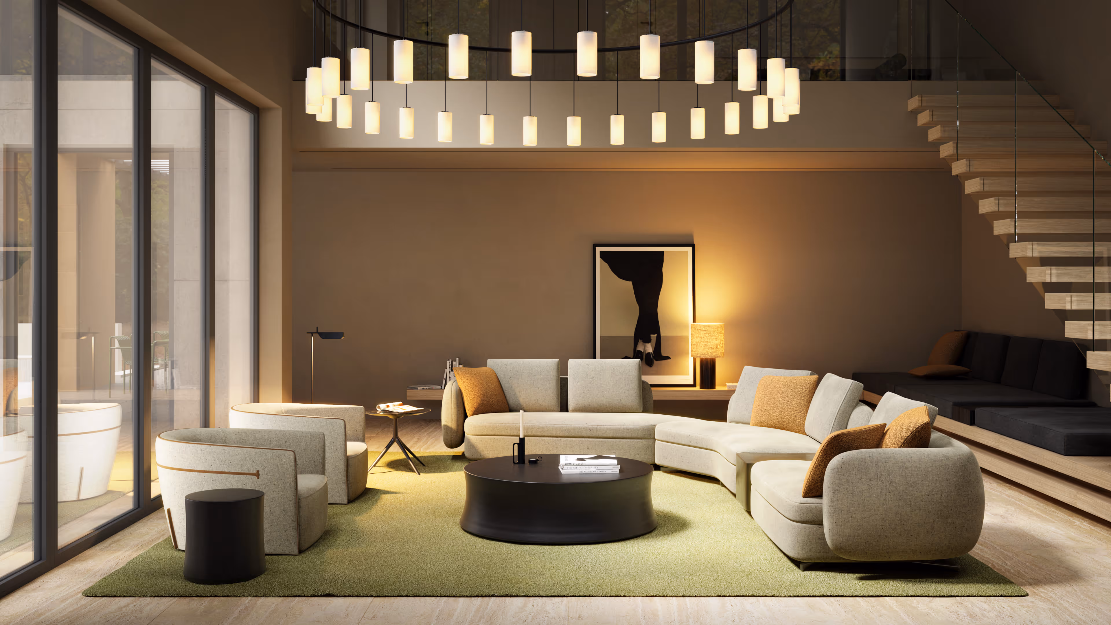 The emotional center of the building is the roomy atrium where the big living room with the fireplace locates. The vertical construction of the fireplace, more than 6 meters high, is lined with travertine. This solution emphasizes the height of the space. Saint-Germain sofa system from the new Poliform collection shows the sensitivity of our world. The large-scale pendant by Santa & Cole works just the same way. The color and intensity of its light immerse us in the sunset atmosphere.