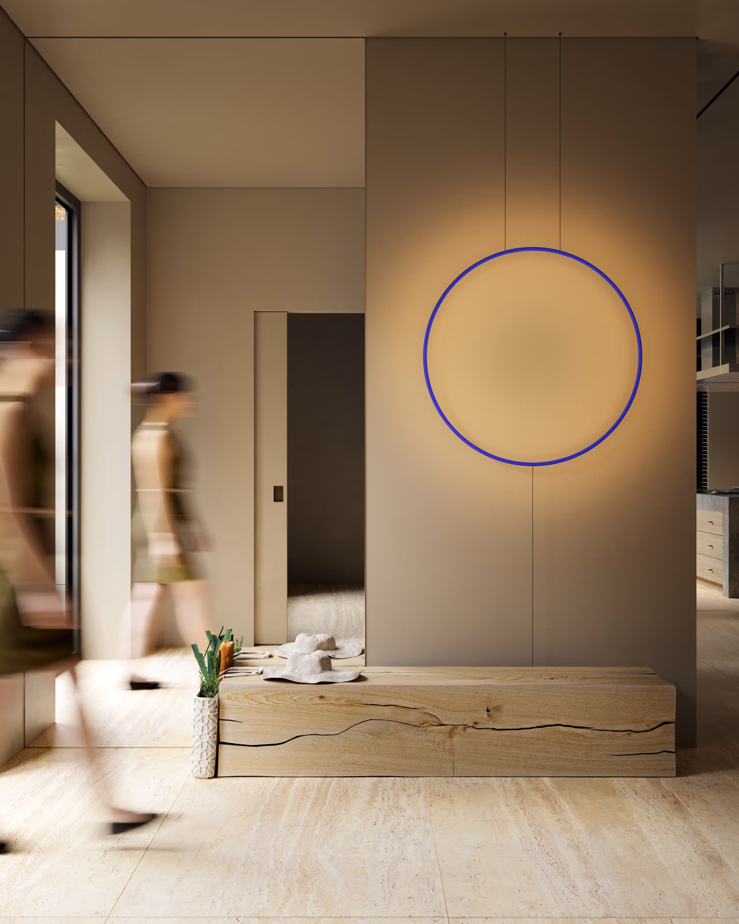 The whole interior was created with natural colors and surfaces like stone, light oak and microcement. Sometimes you can meet deep red objects there. We offered them as a good wine for dinner.