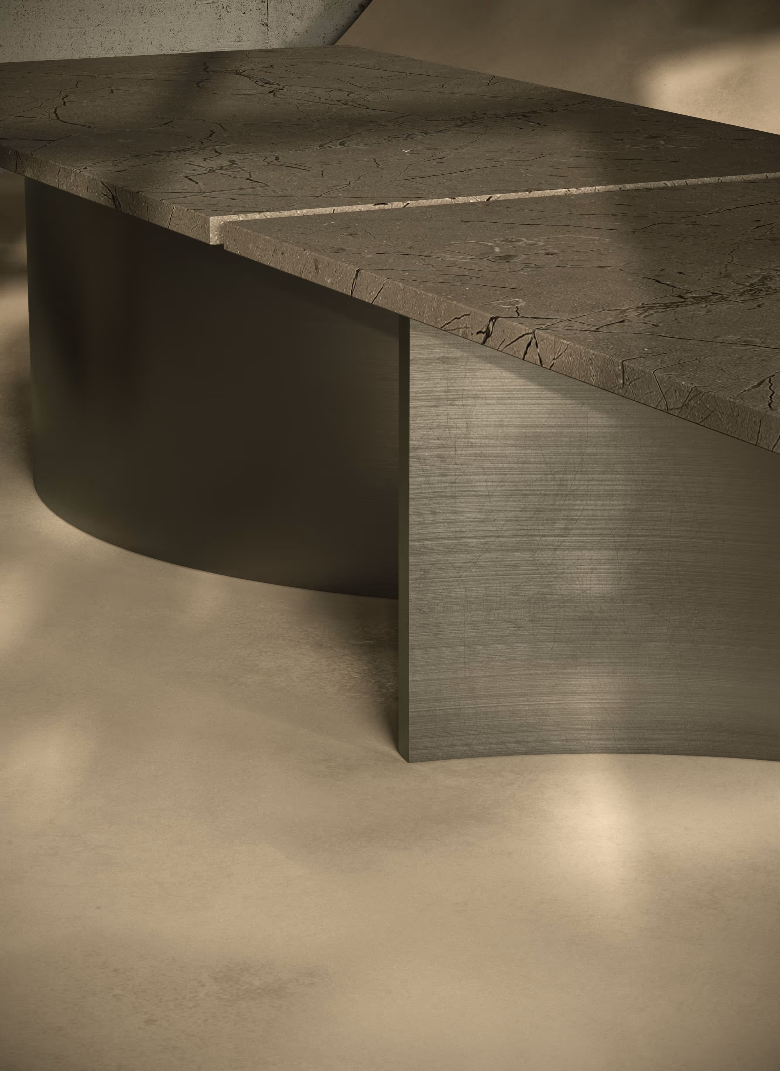 The main kitchen and the dining room are united. The large table in the dining room was designed by Bogdanova Bureau. It has a wave-shaped steel base and a stone tabletop which is divided into two equal parts. It offers two options on how to use the table. When there are only family members at the table, they occupy one part, and the other can be decorated with candles, a vase with flowers, or other decorative stuff that creates a mood. The table does not feel outrageous and empty this way. When the house is full of guests, the whole tabletop becomes functional.