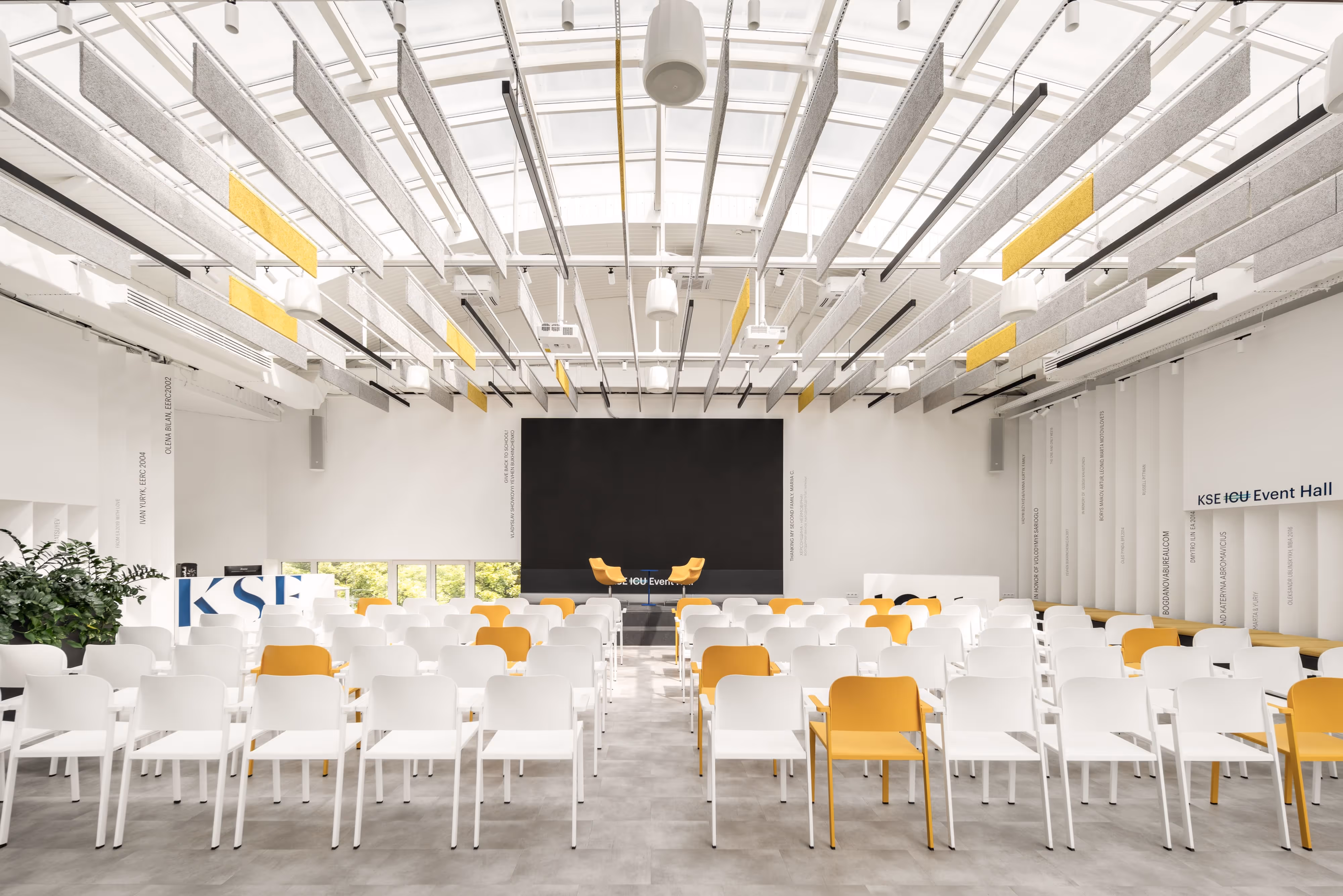In the lobby on the first floor is a kind of "wall of gratitude" with the names of benefactors and donor companies that provided funds for the development of KSE and the campus facilities. The second place of honor, where the partners of the educational institution are listed, is the event hall on the top floor of the building. Entire floors, corridors, and auditoriums are dedicated to companies that were involved in the project to the fullest extent possible and supported it with large sums of money, and their logos are branded with their logos.