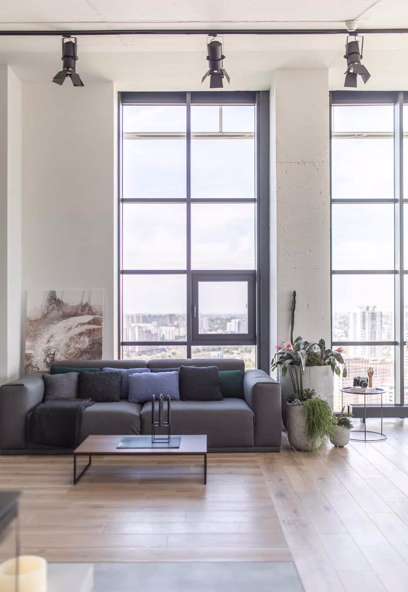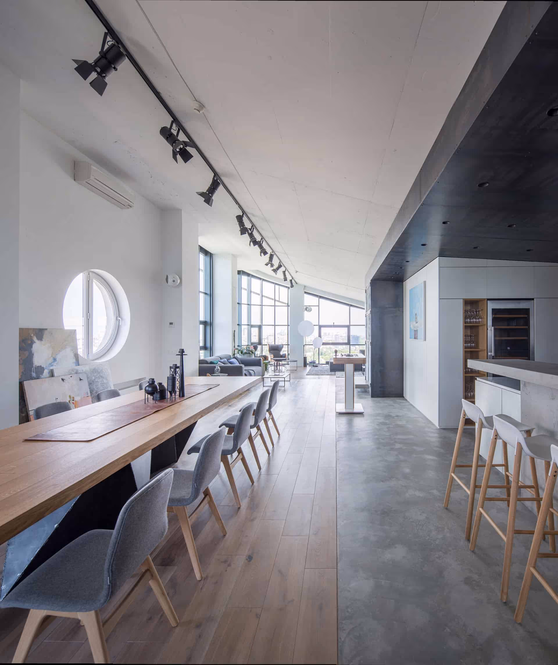 We visually divided the space with lines originating at the doors in the center, thus separating it into the living room, master bedroom and service areas. Smart zoning has transformed the apartment into visually clean and bright environment; visitors are able to see an endless open space upon entering the apartment; all service areas and staff rooms are tucked into the lower part of the premises that has the sloped ceiling.