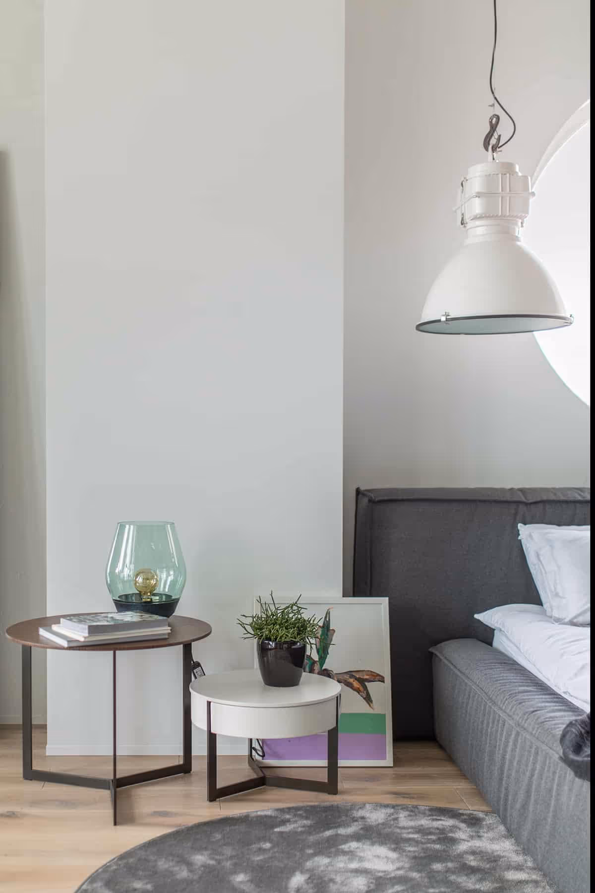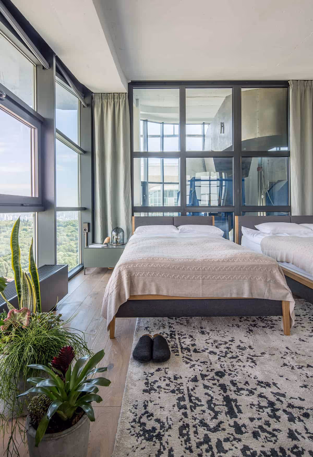 P26 apartment is a former equipment room converted into a living area. The space benefited from a high ceiling, up to 6m in places, however it had some disadvantages as well, such as a sloping ceiling that complicated the design implementation.